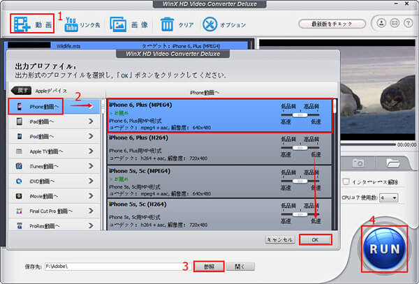 WinX HD Video Converter Deluxeは370以上のプロファイルを内蔵し、AVI, WMV, 3GP, MP4, FLVなどのSD動画(標準動画)とMKV, AVCHD, MOVHD, MTSなどのHD動画の相互変換ができる以外、Android(Samsung Galaxy S5,富士通, New Nexus7, AQUOSなど),Microsoft(Lumia1020,Surface,XBOXなど),Apple(iPhone5s/iPhone5c, iPad Air/mini (Retinaディスプレイモデル)),SONY(PS4/PS3/Xperia など)ににぴったりの形式&サイズを内蔵して、変換操作を便利にする。iPhone6に動画を取り込み再生する前に、ビデオとオーディオを調節できる。ビデオのコーデック、解像度、アスペクト比、フレームレート、ビットレートなど、オーディオのコーデック、ビットレート、サンプルレートなどを設定して、iPhoneにもっとも合うようにする。それに加えて、旅行で撮った綺麗な写真や、動画から抽出した画像などを個性的な音楽付きスライドショーに作成することも可能だ。また、YouTubeからオンライン動画をダウンロードして、MP3, MP4, MOV, AVI, iPhone, iPadなどに変換することもできる。